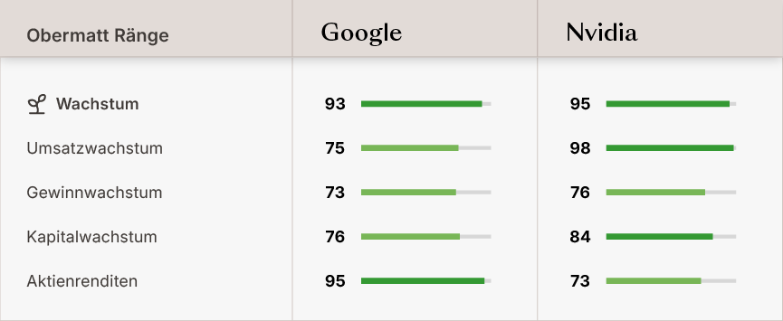 Während NVIDIA mit einem Wachstumsrang von 95, getrieben durch die unersättliche Chip-Nachfrage, den Spitzenplatz belegt, liegt Google mit 93 nur knapp dahinter. Der Unterschied liegt in der Zusammensetzung dieses Wachstums. NVIDIA erlebt einen historischen Umsatzsprung, aber Google funktioniert wie eine Zinseszins-Maschine.