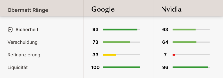 Google ist eine finanzielle Festung. Ein Haupttreiber hierfür ist der Verschuldungsgrad (Leverage). Google glänzt mit einem überlegenen Verschuldungs-Rang von 73 und übertrifft damit NVIDIAs Rang 64 deutlich. Dies zeigt, dass Google mit einem gesünderen Polster aus Eigenkapital im Verhältnis zu Schulden operiert. Das gibt dem Unternehmen mehr Freiheit, Kartellstrafen zu verkraften oder massive KI-Infrastruktur ohne finanzielle Belastung zu finanzieren.