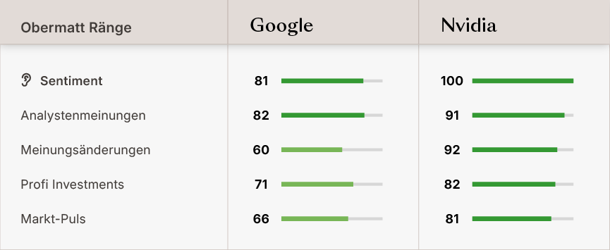 - Nvidia bleibt der Favorit für alle die auf das reine Momentum des KI-Hardware-Booms setzen wollen. Mit dem perfekten Sentiment Rang (100) und einem Wachstumsrang von 95 ist es der unangefochtene Anführer der aktuellen KI-Rallye. Aber Vorsicht vor der extrem teuren Bewertung beim Markt-zu-Buchwert (Rang 1).