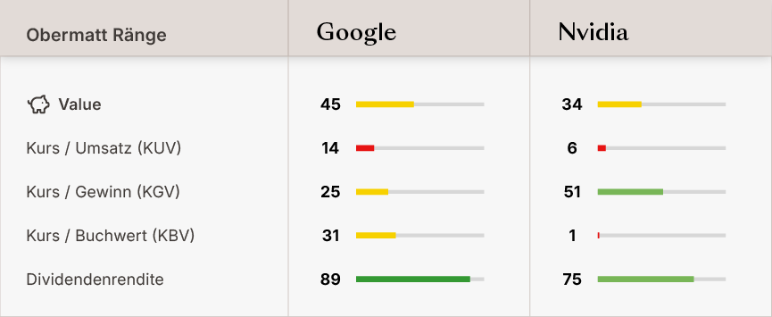 Keine der beiden Aktien ist „billig“. Das ist der Preis, den man für High-Tech-Aktien zahlen muss. Googles Value Rang von 45 bietet jedoch einen deutlich besseren Wert als NVIDIA mit einem Value Rang von 34.