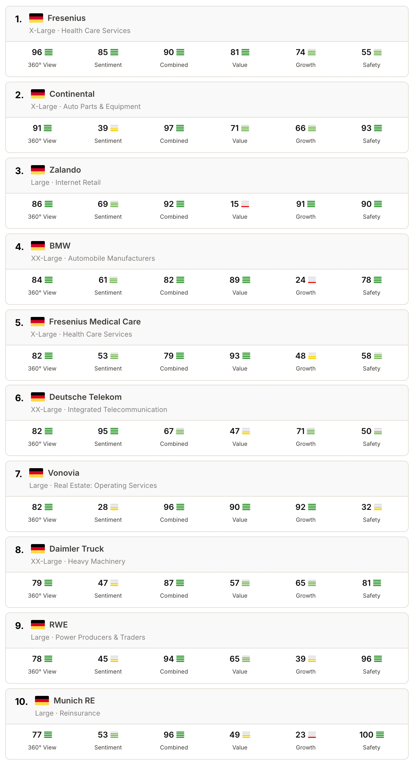 - Fresenius (360° View rank: 96): A global health care group offering services for dialysis, hospitals, and outpatient medical care. Its top ranking suggests a strong, all-around profile, making it a classic defensive stock in an uncertain economy.