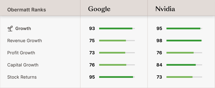 When we look at the Stock Returns (or TSR Total Shareholder Return) metric, Google actually scores a stellar rank of 95, significantly outperforming NVIDIA's Rank 73. This suggests that while NVIDIA is growing its top line faster right now, Google is better at delivering shareholder returns.