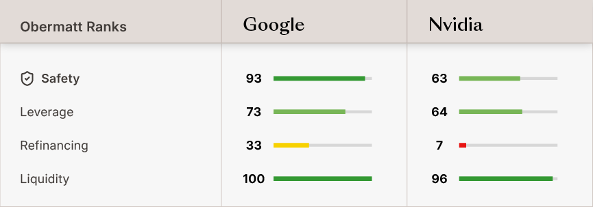 Google is a financial fortress. A key driver here is Leverage. Google boasts a superior Leverage Rank of 73, significantly outperforming NVIDIA's Rank 64. This indicates that Google is operating with a healthier debt-to-equity buffer, giving it more freedom to weather antitrust fines or fund massive AI infrastructure without financial strain.