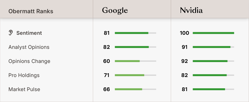 NVIDIA holds a perfect Sentiment Rank of 100, driven by a dominant Analyst Opinions Rank of 91. This "perfect" score is a double-edged sword. It means the market is priced for absolute perfection—investors and analysts are unanimously bullish, leaving little room for error. Any hiccup in the Blackwell supply chain could trigger a pullback.