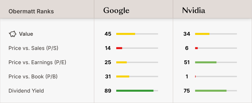 Neither stock is "cheap"—that’s the price of admission for high-flying tech. However, Google’s Value Rank of 49 offers significantly better value than NVIDIA (Value Rank 30).